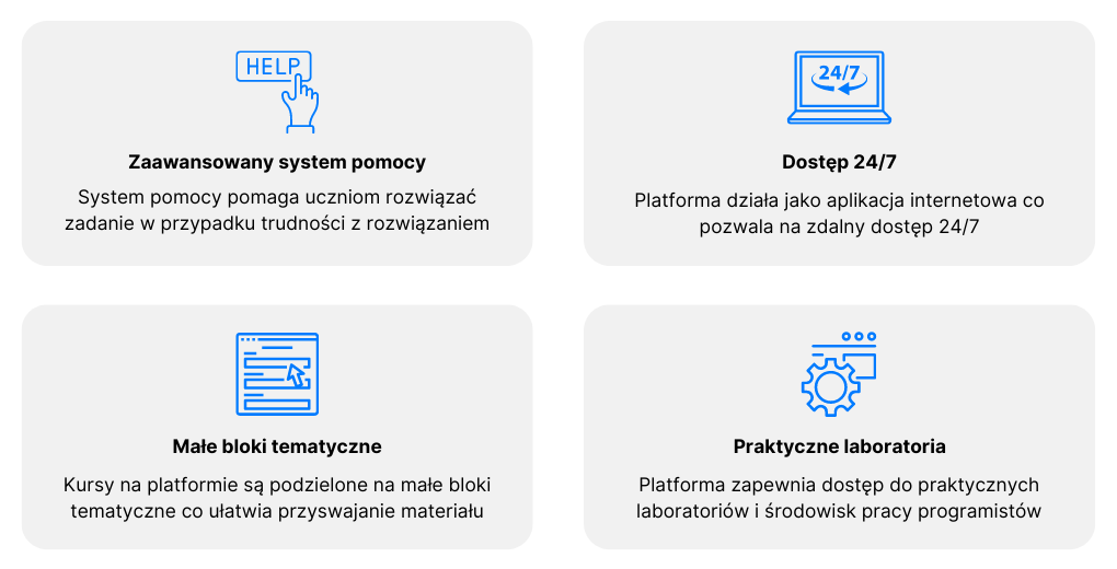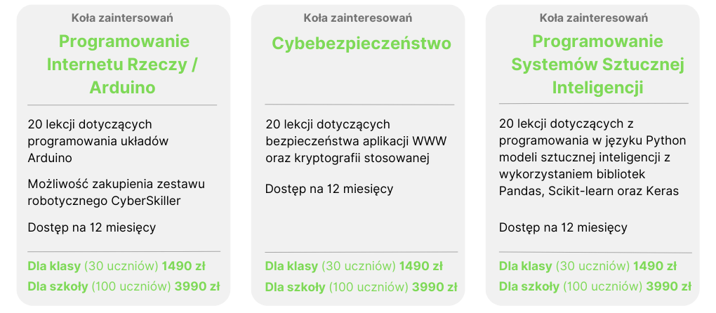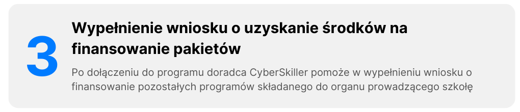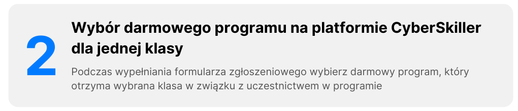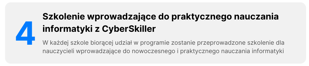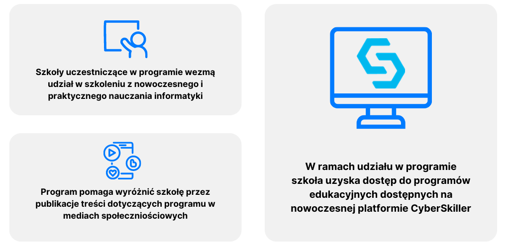 W ramach udziału w programie szkoła otrzyma wsparcie w uzyskaniu środków na finansowanie udziału w programie a także dostęp do nowoczesnej platformy edukacyjnej CyberSkiller wraz z programami praktycznego nauczania informatyki zgodnymi z podstawą programową i dostosowanymi do określonych poziomów nauczania.