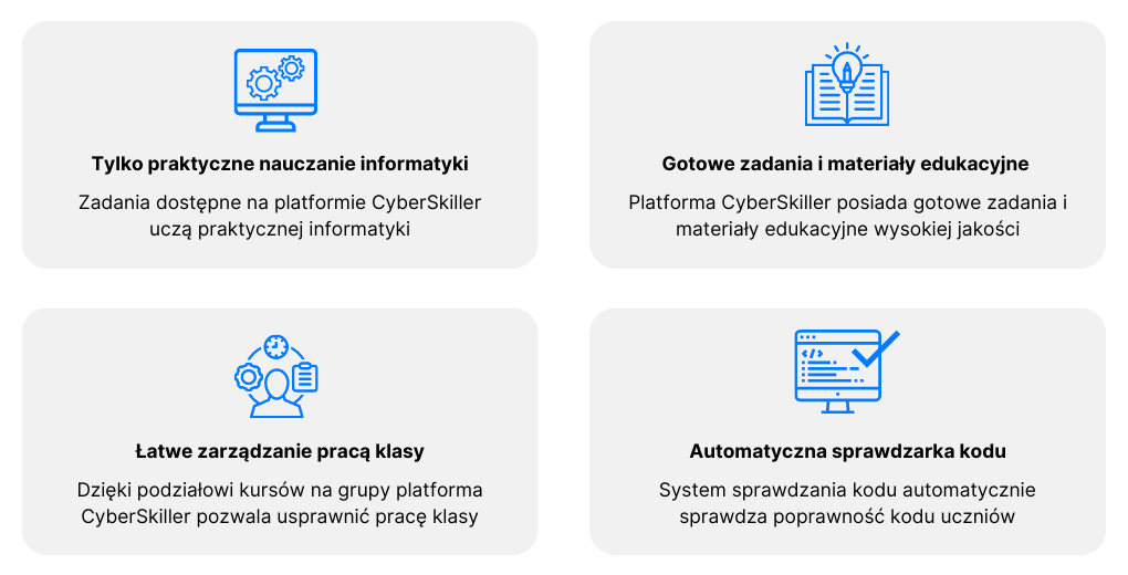 Platforma CyberSkiller to owoc wspólnej pracy przedstawicieli środowiska akademickiego i specjalistów branży IT. Dzięki temu kursy dostępne na platformie CyberSkiller nauczają praktycznych umiejętności informatycznych wykorzystywanych w codziennej pracy w branży IT w sposób zgodny z najnowszymi standardami edukacyjnymi. Kursy dostępne na platformie CyberSkiller są dopasowane do każdego poziomu i profilu nauczania a także są zgodne z obowiązującą podstawą programową.