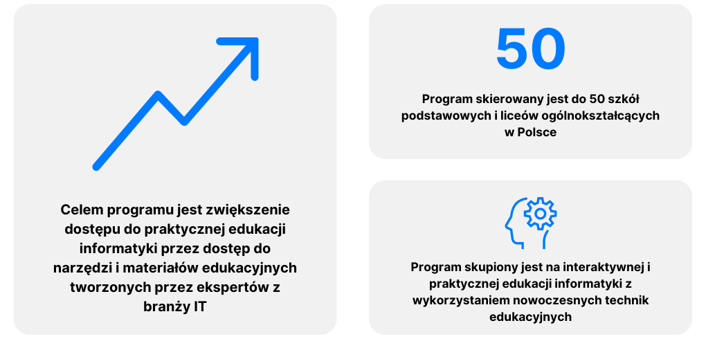 "Praktyczna Szkoła IT" to program dla 50 szkół podstawowych i liceów ogólnokształcących w Polsce, którego celem jest zwiększanie dostępu do wysokiej jakości edukacji informatycznej.
